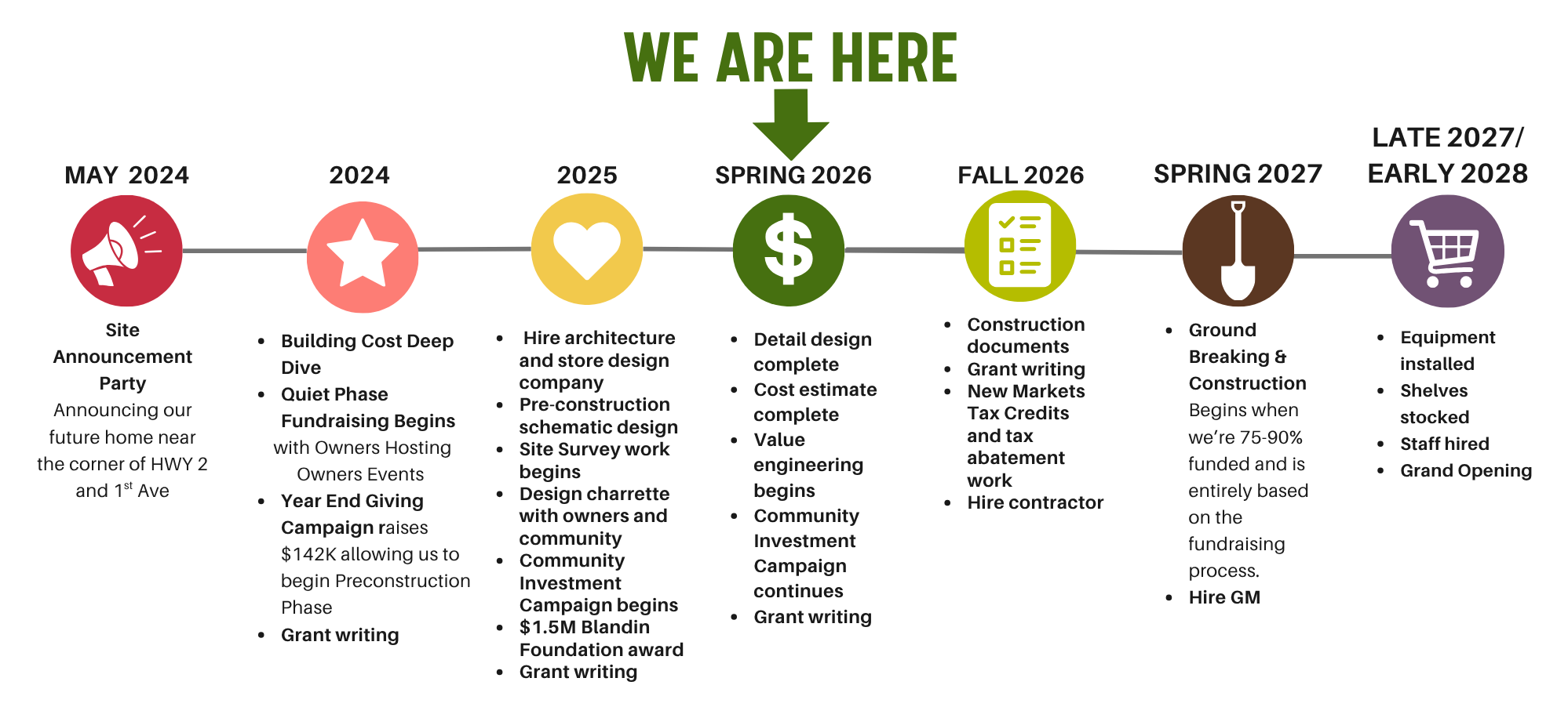 Currently, the total funding required to open our store is $6.3 million. We are currently submitting multiple grant applications, and will also be working with future vendors to take advantage of any credits they offer to new stores. Repaying loans or other commercial debt is not viable for the Co-op’s financial projections, so the goal is to raise as much funding as possible from the sources listed here. We are currently forging relationships with organizations that provide no to low interest loans if the case arises that we will need to bridge funding gaps.