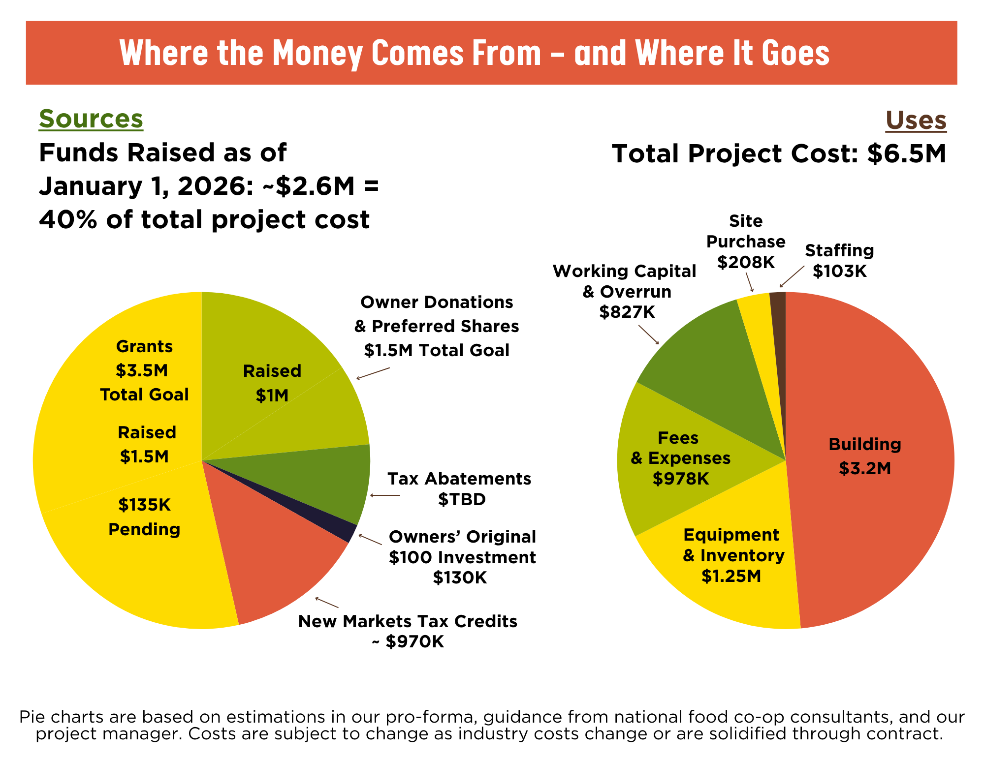 Both pie charts are subject to change as industry costs change or are solidified through contract. The “Sources” chart is currently based on estimations in our pro-forma, guidance given to us from national food co-op consultants, and our project manager from 45 North Group.
